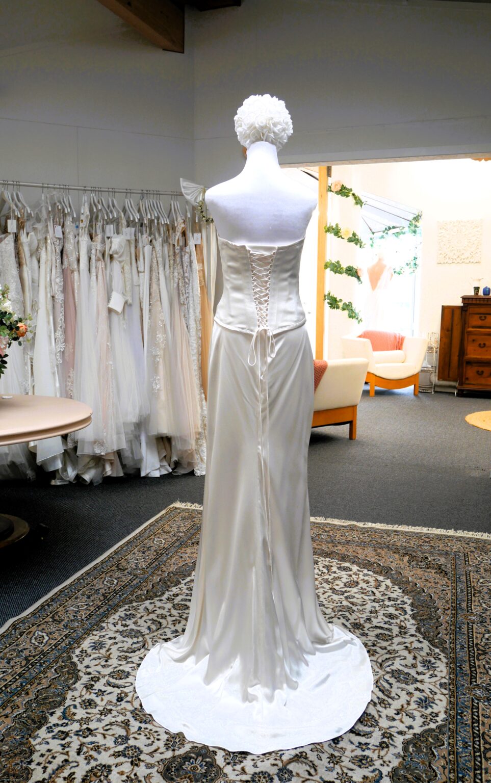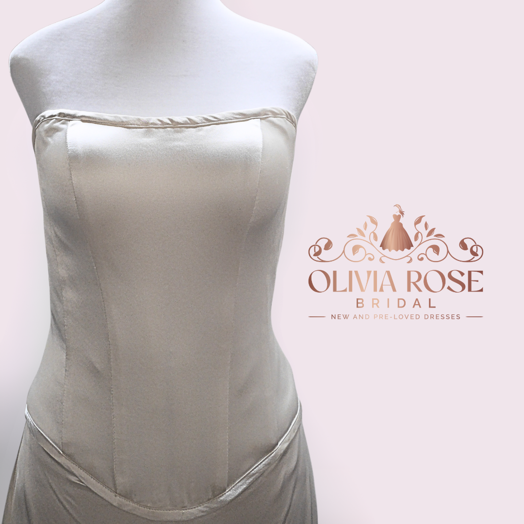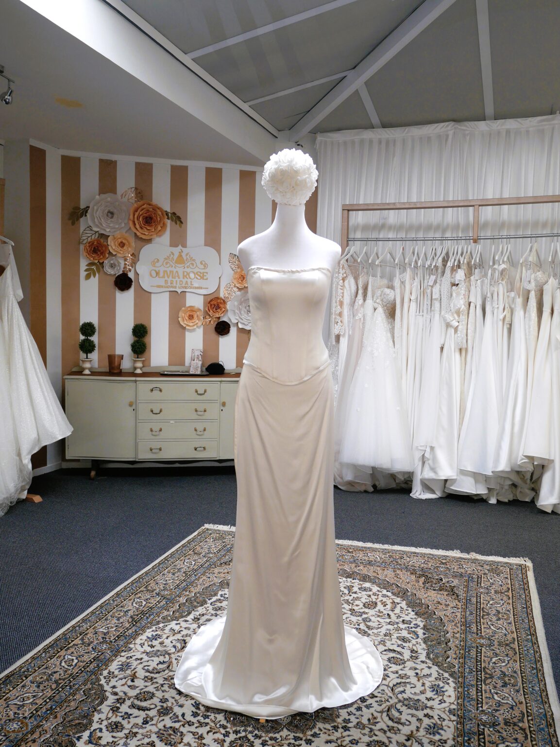 Jordan Gown – Pre‑Loved Designer Silk Wedding Dress by Aston Bridal. Featuring a structured corset bodice, sleek slim‑fit silk skirt, and a soft puddle train. Available now at Olivia Rose Bridal, Paraparaumu Beach, Kapiti.