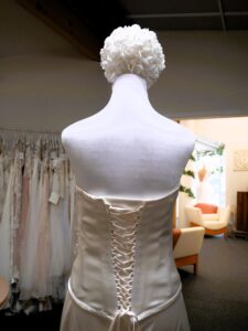 Pre‑loved designer gown • 100% silk • corset bodice • slim-fit skirt • puddle train