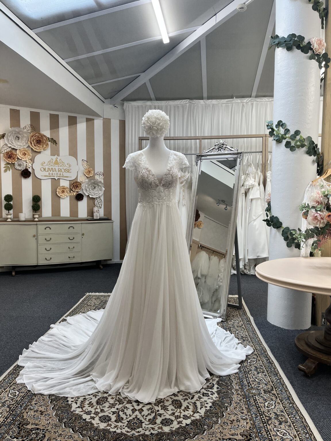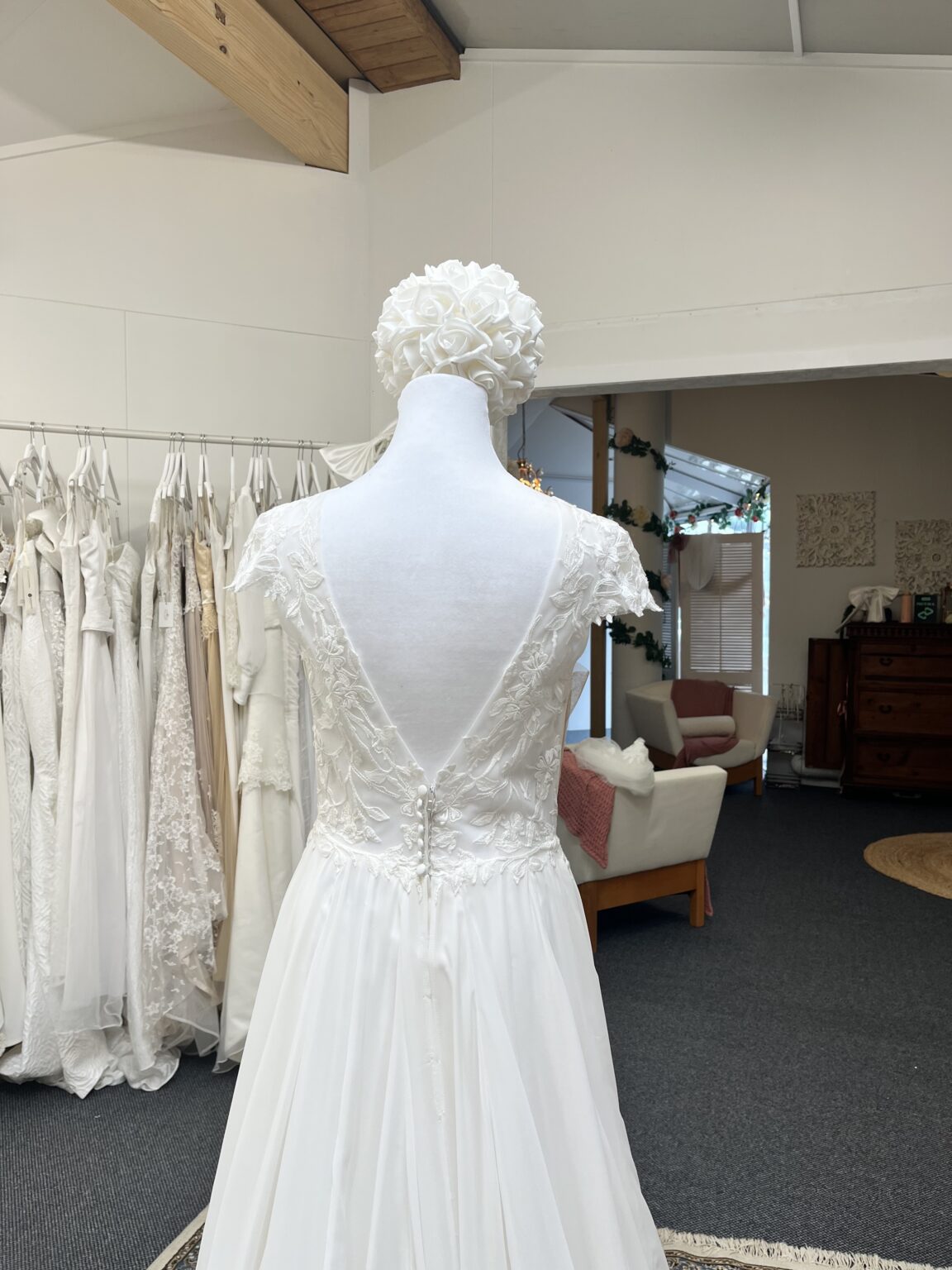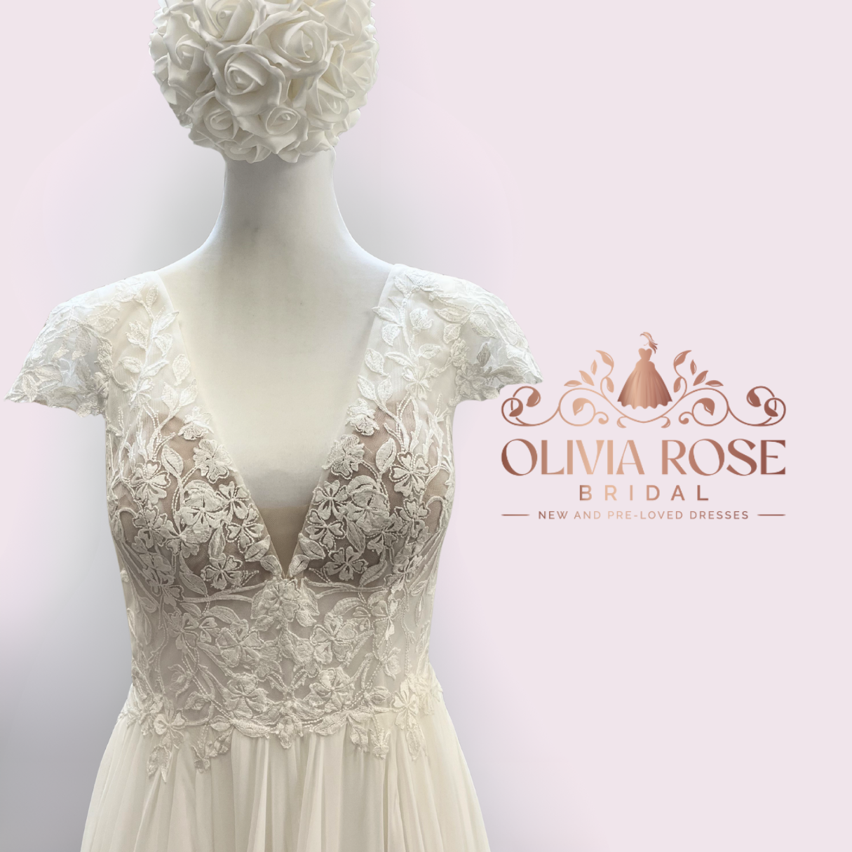 Designed for the bride who loves soft, feminine detail, this gown features a beautifully structured lace bodice with delicate cap sleeves, creating a flattering and romantic silhouette. The bodice offers just the right amount of support while still feeling light and effortless. Flowing seamlessly from the waist, the chiffon skirt adds movement and softness, making it ideal for brides wanting a graceful, floaty look without the weight of a traditional gown.