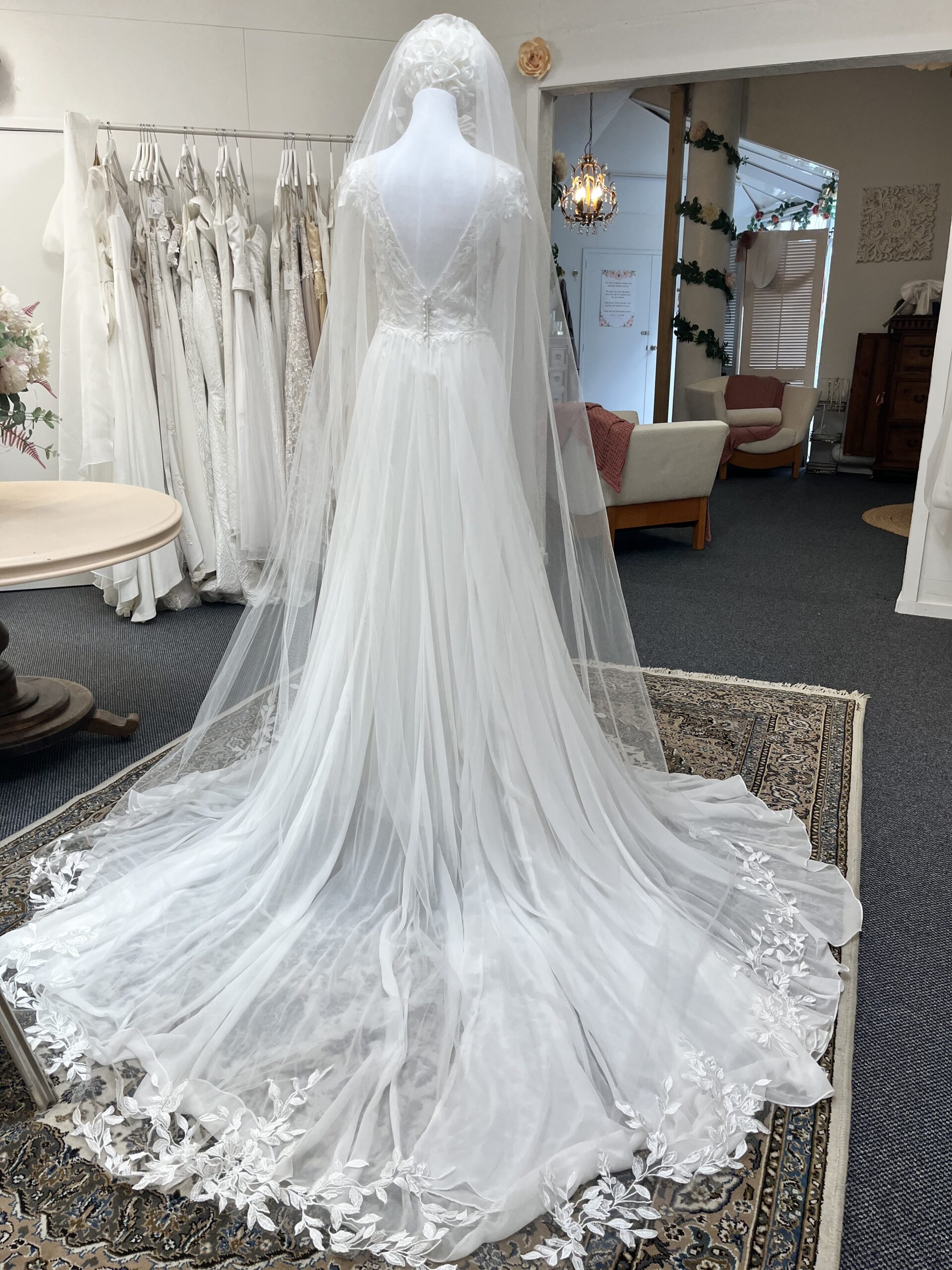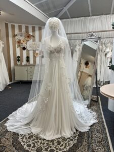 To complete the look, this gown is paired with a custom veil, adding an extra touch of elegance and individuality to your bridal style.