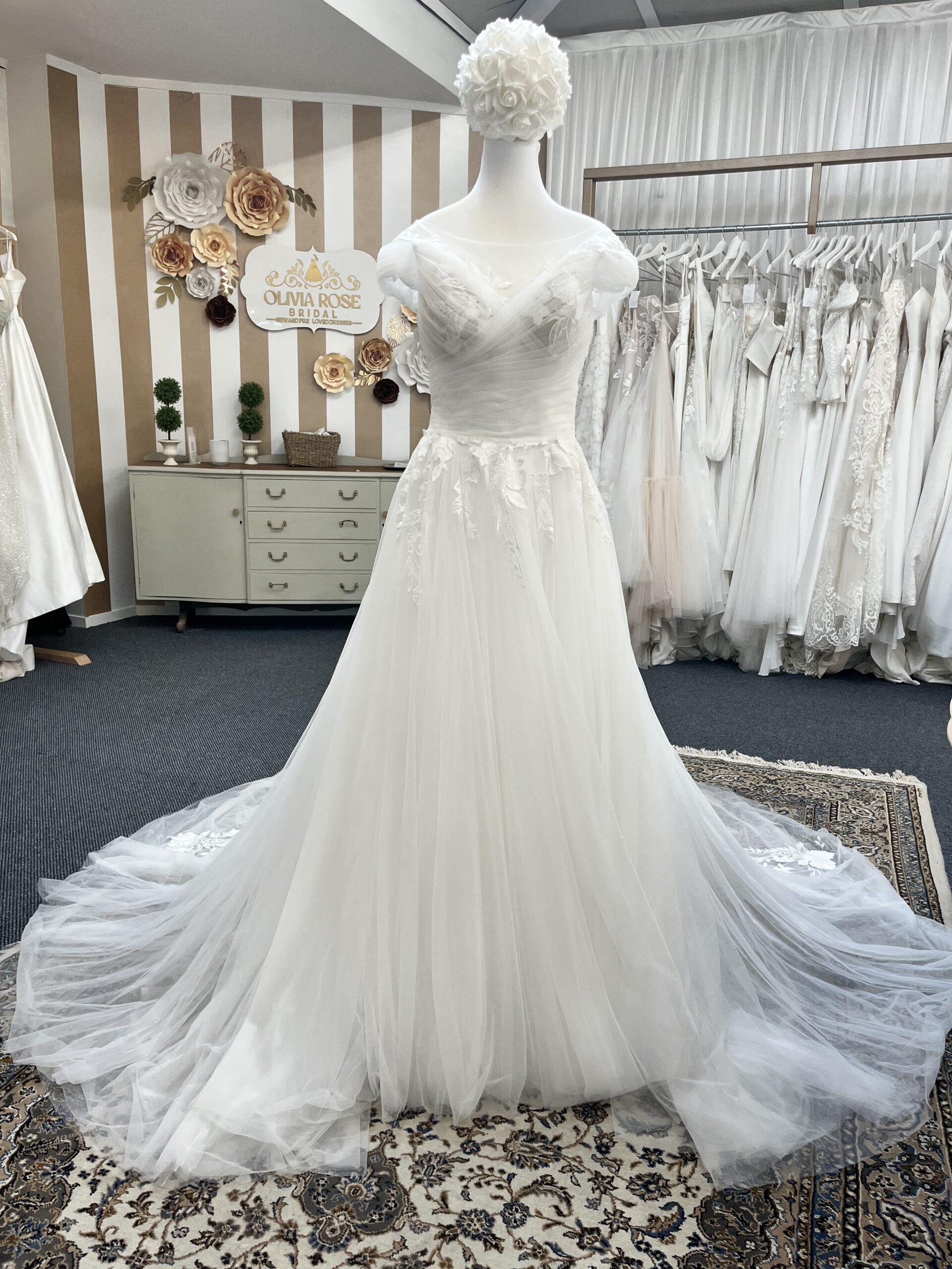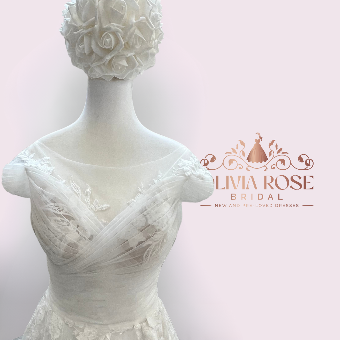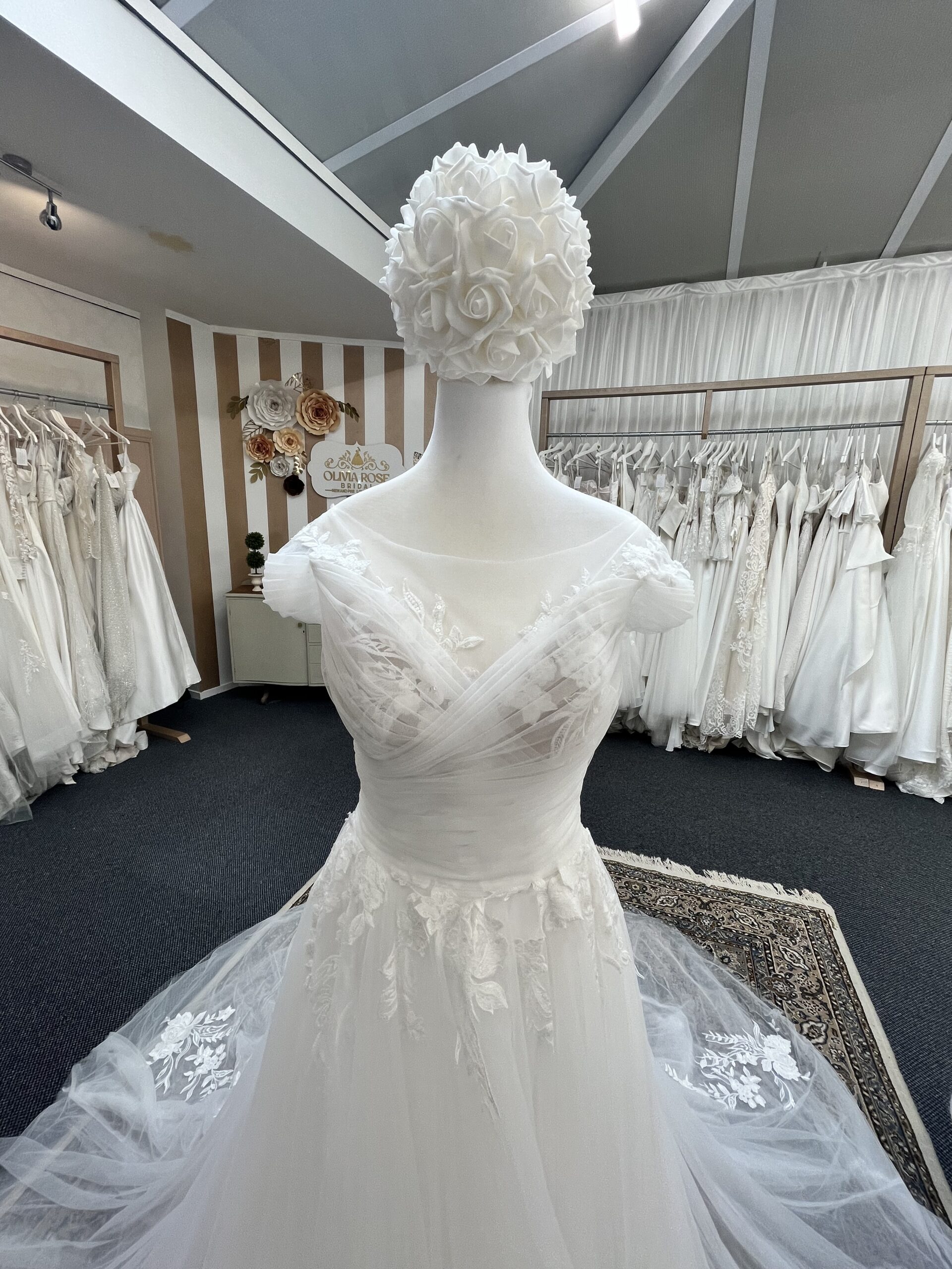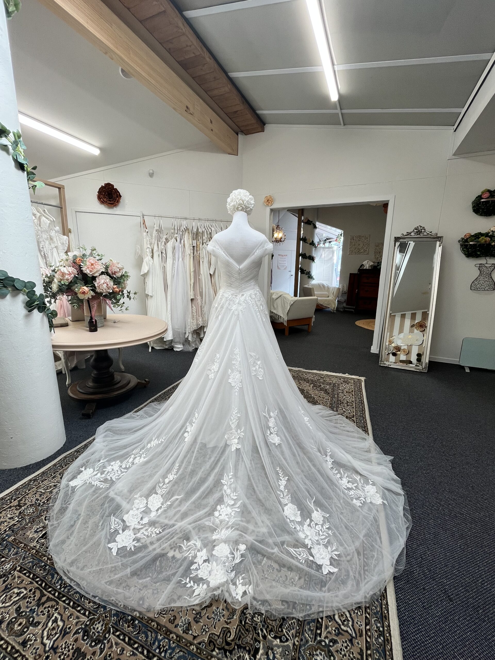Originally known as the Alison gown, this design showcases a beautifully structured bodice with delicate floral appliqué that gently flows into an illusion neckline. The sheer detailing creates a soft, feminine frame across the shoulders, while the off-shoulder tulle sleeves add a romantic, ethereal feel.