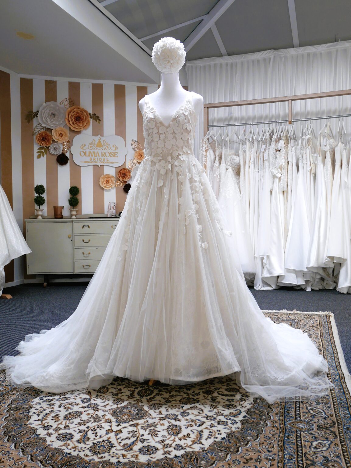 A refined ball-gown in soft blush-nude tulle, beautifully adorned with hand-cut 3D floral appliqués, featuring a plunging V-neck and elegant open back. Available at Olivia Rose Bridal on the Kapiti Coast.