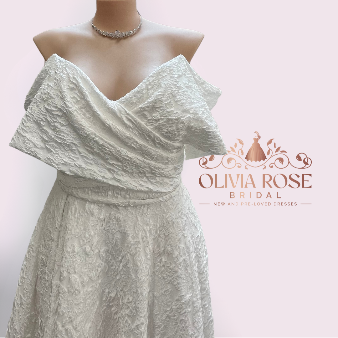 Crafted from a beautifully textured fabric, this gown features a structured off-shoulder neckline with a soft fold-over detail that enhances and flatters the décolletage. The bodice offers support and shape, creating a clean, sculpted silhouette that flows seamlessly into a full A-line skirt.