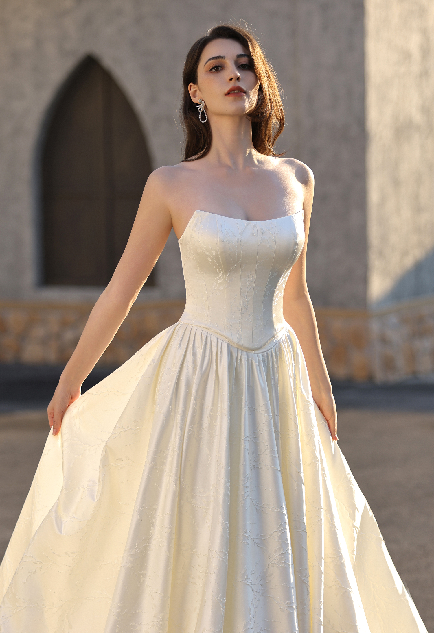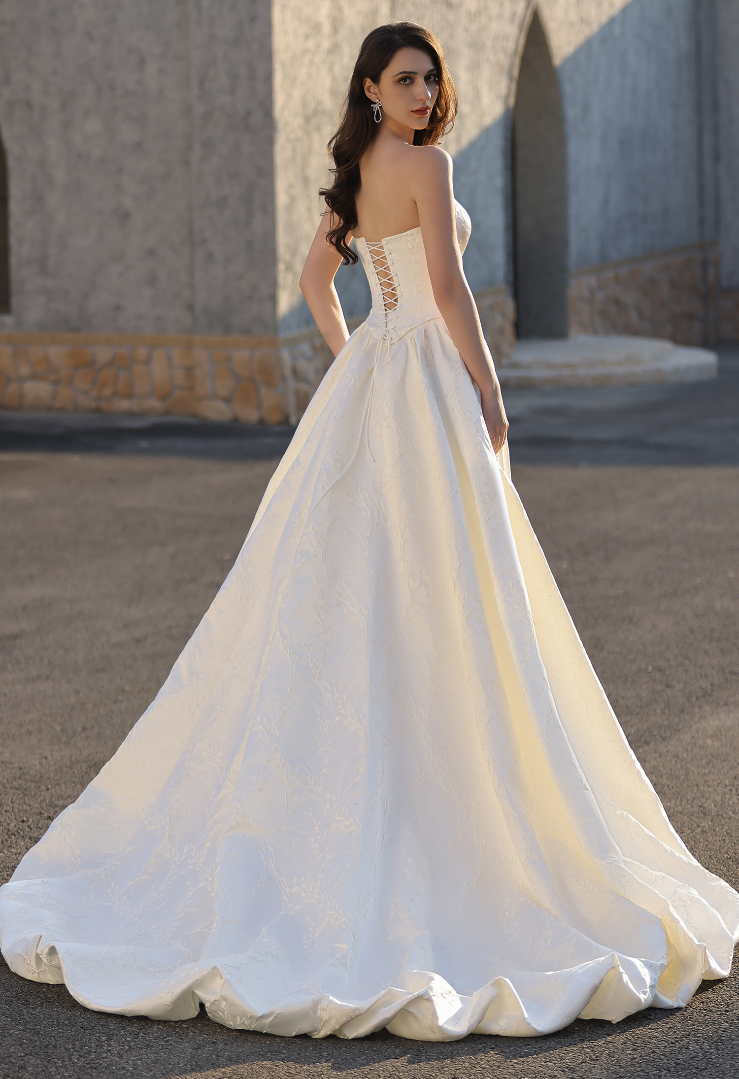 Lucilla – Jacquard Satin Wedding Ball Gown with Dramatic Train (Style HW3816B) at Olivia Rose Bridal is a show-stopping choice for brides seeking one of the most elegant Wellington wedding dresses. Crafted from lustrous ivory Jacquard satin with delicate woven floral patterns, this strapless wedding dress features a tailored corset bodice that defines the waist and a voluminous ball gown skirt that flows with airy grace.
