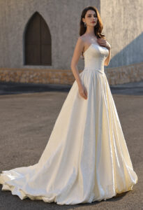 For versatility, the bodice and skirt are sold separately, and there is also a mermaid option for brides who prefer a more fitted style. Whether you’re planning a classic, romantic wedding or a modern celebration, Lucilla is one of the most exquisite Jacquard satin wedding dresses available in Wellington.