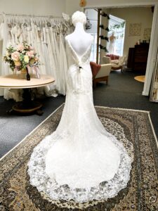 The Rischelle gown by Madi Lane Bridal is a true showstopper — designed for the bride who loves a touch of shimmer and a silhouette that celebrates her curves. Crafted in a romantic mermaid style, Rischelle features delicate lace detailing throughout and a soft shimmer finish that catches the light beautifully. The gown’s low plunging neckline at both the front and back adds a modern allure, while the beautiful long train completes the look with graceful drama.