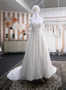 The Amy Dress by Maggie Sottero is designed for brides who love elegance with sparkle. This off-the-shoulder A-line gown features a draped bodice shaped in a romantic love heart silhouette, flattering the waist and bust.