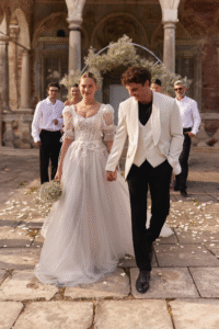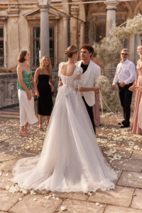 The Loren gown by Ukrainian designer Nataliya Vilchuck is the perfect balance of elegance and modern detail. Its beautifully crafted semi-transparent lace corset highlights intricate craftsmanship, while the A-line silhouette flows into a full skirt that moves effortlessly with every step. The skirt features a delicate slight sheen that catches the light, adding an ethereal touch, and extends into a long train for a dramatic finish.