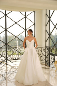 Crafted in luxurious mikado, Laurenne features a beautifully structured strapless corset bodice with internal boning for support, shape, and a flattering silhouette. The soft sweetheart neckline frames the décolletage in the most romantic way, while the elegant basque waistline creates a stunning transition into the full, voluminous skirt. And yes — she even has pockets, giving this gown the perfect balance of practicality and bridal magic.