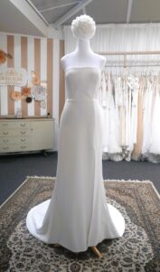 Its minimalist silhouette is enhanced by a soft flowing skirt with a small train and a refined front slit, giving the gown both movement and subtle allure. The Victoria gown is timeless, flattering, and effortlessly chic — ideal for a bride seeking both structure and softness in one perfect design.