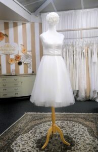 When it’s time to celebrate, the overskirt can be removed to reveal a chic bridal mini dress paired with a soft tulle A-line skirt, creating a fun and flowy second look that’s perfect for dancing the night away. This gown’s transformative design ensures brides don’t have to choose between classic elegance and modern party-ready style.